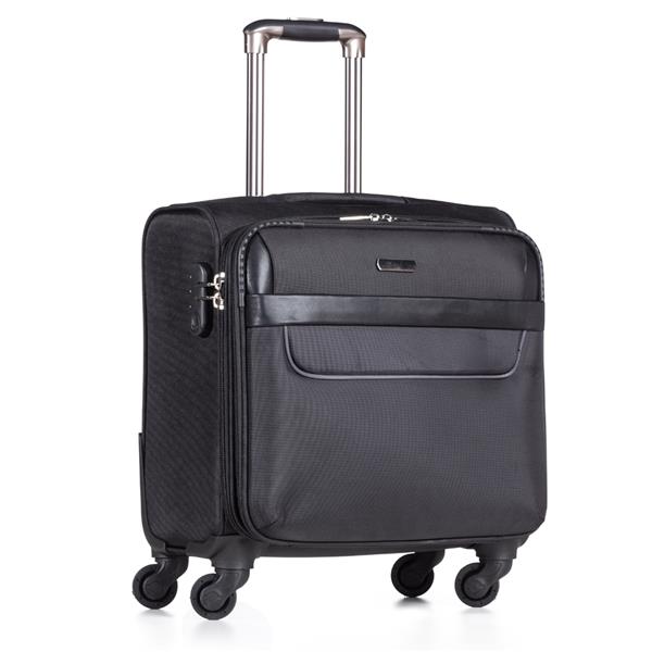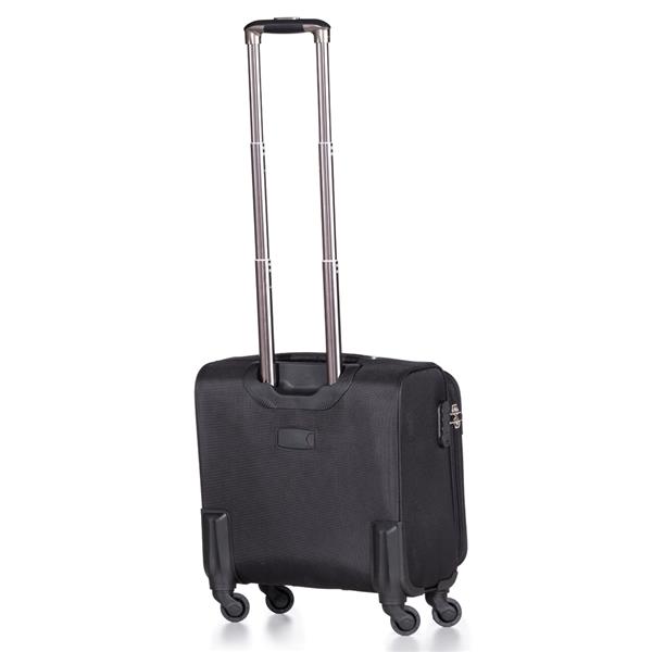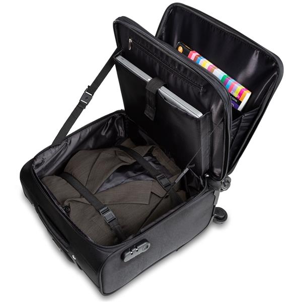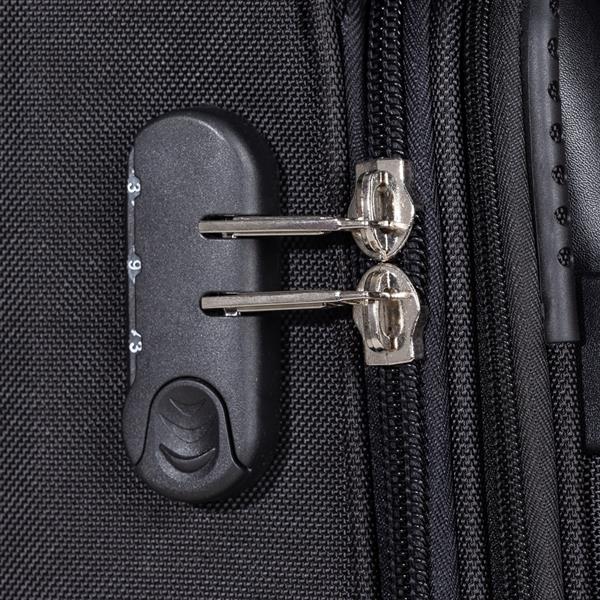 Mala de viagem com cadeado TSA. Confeccionada em nylon de alta qualidade, possui alça de mão, puxador retrátil com estágios para regulagem e botão acionador, cadeado de segredo, sistema com 4 rodas multidirecionais, identificador de bagagens na parte traseira, bolso frontal com detalhe externo em couro sintético e bolso superior médio com divisória. Compartimento principal com bolso para notebook até 13.3 polegadas, bolso pequeno e forro com zíper. A parte interna conta com um sistema organizatório através de alças de nylon ajustáveis, quando utilizadas impedem que as roupas se movimentem dentro da mala durante o transporte. Acompanha plaquinha para personalização. Utilização do cadeado: para criar um segredo pressione e segure o botão “push”, crie a numeração desejada e em seguida solte o botão para assumir a codificação criada, repita o mesmo processo sempre que necessitar fazer alguma alteração. Altura : 48 cm Largura : 42 cm Profundidade : 27 cm Medidas aproximadas para gravação (CxL): 1,2 cm x 4,8 cm Peso aproximado (g): 3039