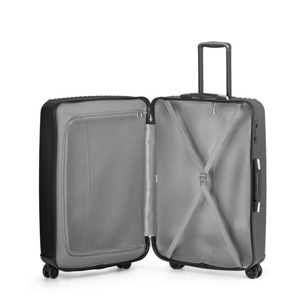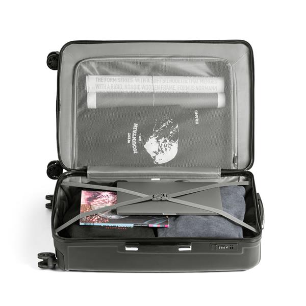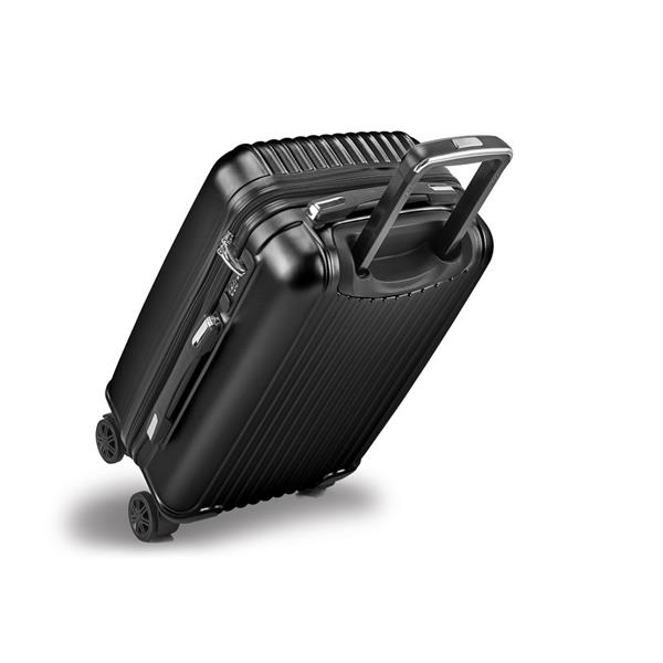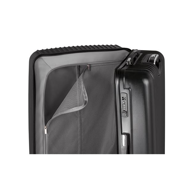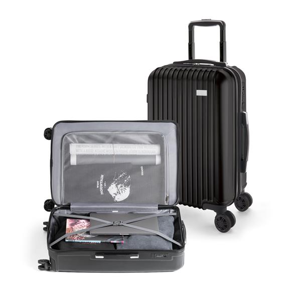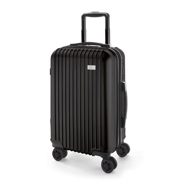 Mala de viagem executivo. ABS e PET. Interior forrado, com divisória. 4 rodas duplas giratórias. Pega extensível em alumínio, com mola (altura pega estendida: 335 mm). Fecho de segurança com senha. Placa metálica removível, para fácil gravação. Capacidade: 90 L. Peso: 4,20 kg. 500 x 775 x 290 mm - Placa: 60 x 30 mm