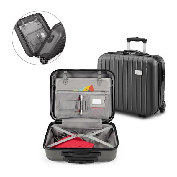 Mala para notebook. ABS. Compartimento interior para notebook 15.6''. Interior forrado. Pega extensível em alumínio, com mola (altura da pega estendida até 630 mm). Fecho de segurança com senha. Placa metálica removível, para fácil gravação. Capacidade até 26 L. Peso: 2,95 kg. 420 x 340 x 195 mm - Placa: 50 x 30 mm