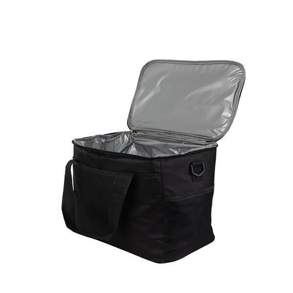 Bolsa térmica confeccionada em Oxford 600D impermeável com camada interna acolchoada, fechamento em zíper e capacidade máxima de 25 litros. Possui revestimento térmico em PEVA antivazamento, além de duas alças fixas em nylon com suporte de juntura e três bolsos externos, incluindo dois em malha. Acompanha alça transversal ajustável.