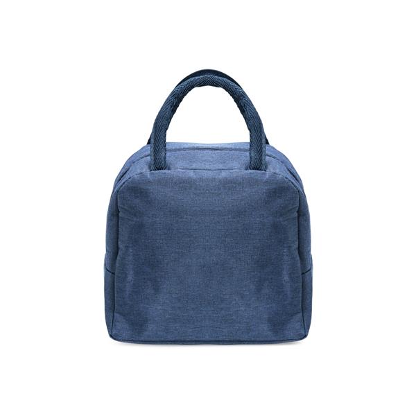 Bolsa térmica feita em poliéster resistente à água e capacidade de até 5 litros. Possui revestimento interno em folha de alumínio, além de bolso frontal com plaquinha fixa em plástico e par de alças de nylon para transporte.