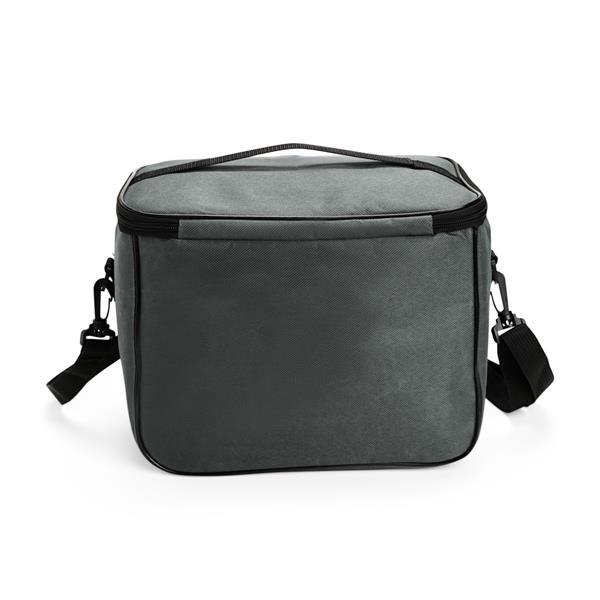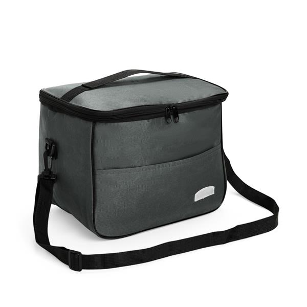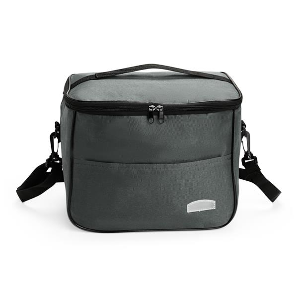 Bolsa térmica feita em Oxford resistente à água, com fechamento em zíper e capacidade de até 13 litros. Possui revestimento térmico em folha de alumínio, bolso frontal externo e duas alças: uma fixa localizada na tampa e outra transversal removível.