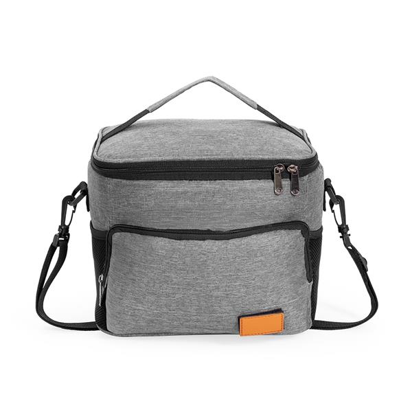 Bolsa térmica confeccionada em Oxford resistente à água, fechamento em zíper, alça de nylon na tampa e capacidade de até 8 litros. Possui revestimento térmico em PEVA atóxico, além de compartimento frontal com plaquinha de couro sintético fixada por velcro e dois bolsos laterais em tela de tecido respirável com elástico. Acompanha alça transversal removível e ajustável.