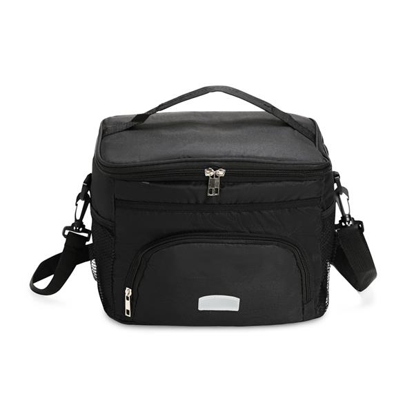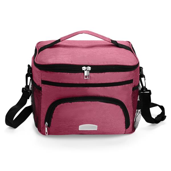 Esta bolsa térmica feita em poliéster resistente à água e revestimento interno em PEVA é uma opção leve e ágil para manter alimentos e líquidos conservados por mais tempo. Com capacidade máxima de 10 litros e fechamento em zíper, ela possui dois bolsos laterais em tela de nylon e um bolso frontal, além de uma alça fixa e outra removível.