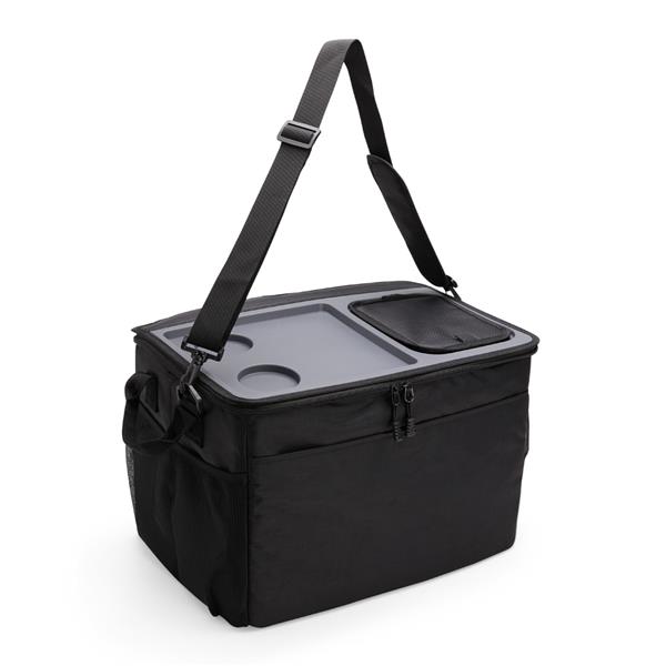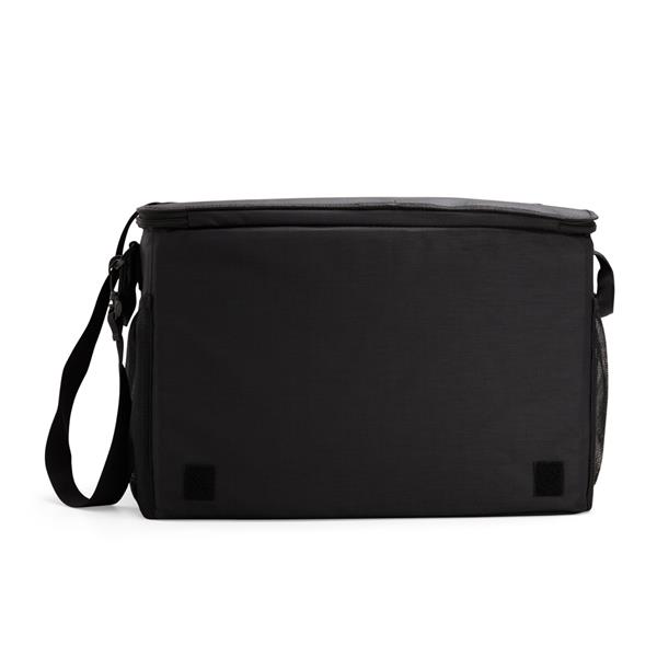 Bolsa térmica confeccionada em poliéster 840D resistente à água e capacidade de até 33 litros. Possui revestimento térmico interno em PEVA atóxico, estrutura dobrável reforçada e tampa rígida em plástico PP com espaço para copos e abertura com fechamento em velcro. Conta ainda com três bolsos externos: um frontal com fechamento em velcro e dois laterais em tela de nylon com elástico. Acompanha alça transversal ajustável com apoio para ombro.