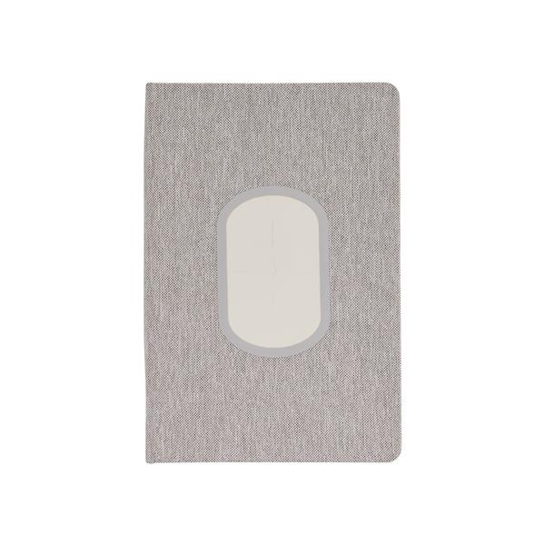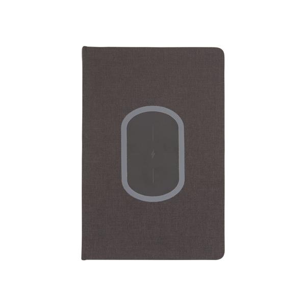 Caderno confeccionado em tecido sintético com carregador por indução, contém aproximadamente 80 folhas pardas pautadas. Possui entrada V8 e acompanha cabo USB, o carregador funciona apenas enquanto conectado à uma fonte de energia, o produto não armazena carga. O carregamento por indução só é compatível com celulares que possuam tecnologia QI. Altura : 21,6 cm Largura : 14,4 cm Espessura : 1,5 cm Medidas aproximadas para gravação (CxL): 5 cm x 13 cm Peso aproximado (g): 310