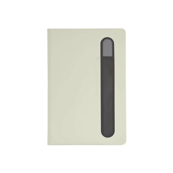 Caderno confeccionado em tecido sintético com suporte para caneta na capa, contém aproximadamente 80 folhas amarelas pautadas. Altura : 21,5 cm Largura : 14,5 cm Espessura : 1,9 cm Medidas aproximadas para gravação (CxL): 21 cm x 8,5 cm Peso aproximado (g): 282