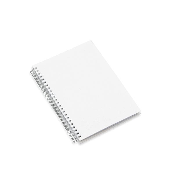 Caderno médio de capa pet sublimático com wire-o pré-fechado. Possui aproximadamente 100 folhas, folha envelope plástica, caderno com página de informações pessoais e contatos. Informações do fornecedor para sublimação: temperatura 200ºC, tempo 25/30 segundos.