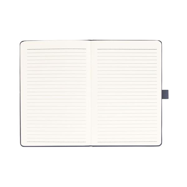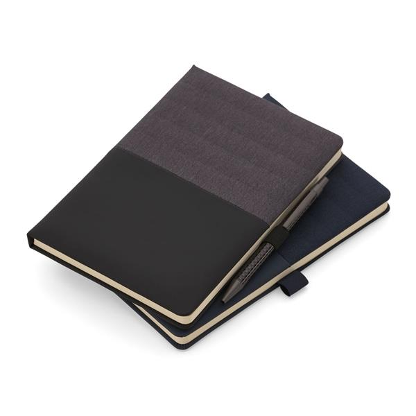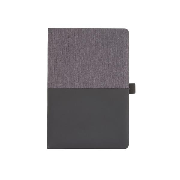 Caderno confeccionado em tecido sintético com parte emborrachada e suporte para caneta na capa, contém aproximadamente 80 folhas amarelas pautadas. Altura : 21,5 cm Largura : 14,5 cm Espessura : 1,8 cm Medidas aproximadas para gravação (CxL): 10,5 cm x 13 cm Peso aproximado (g): 284
