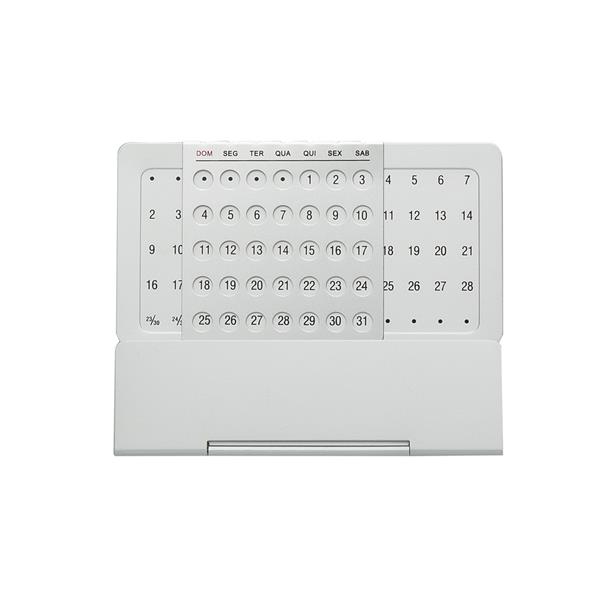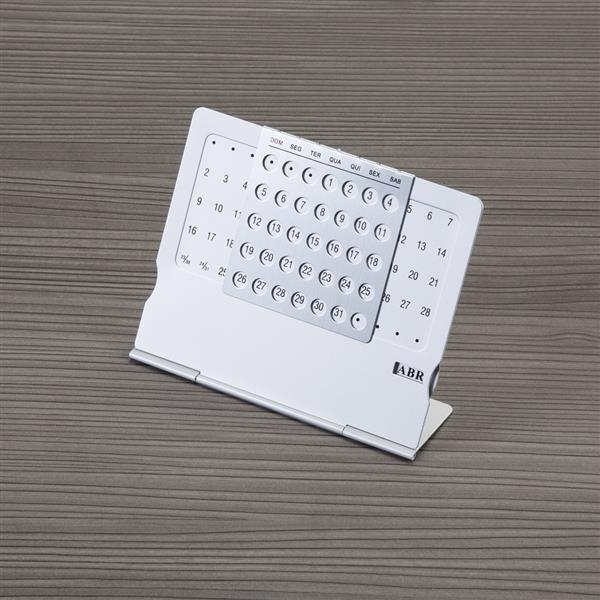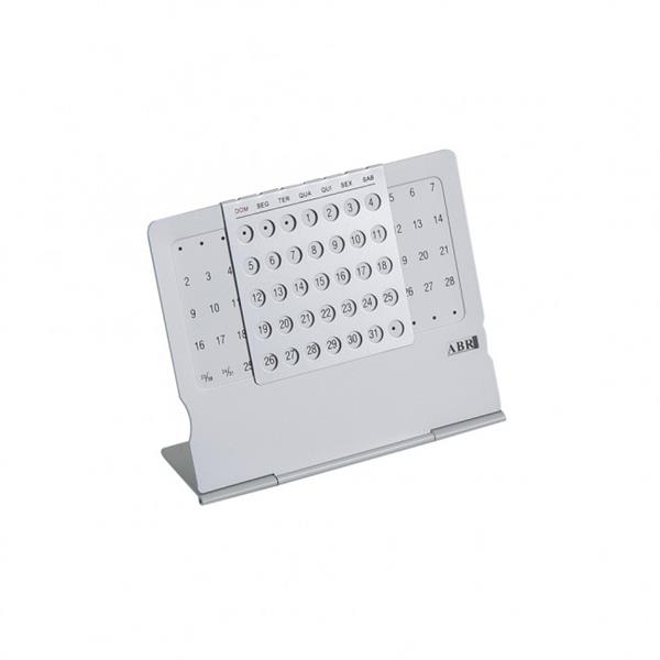 Calendário permanente de metal com base dobrável. Possui chapa de metal com trinta cinco furos(personalizado na parte superior os dias da semana)e mecanismo giratório na parte traseira com os meses. Medidas aproximadas para gravação (CxL): 3 cm x 8,7 cm Tamanho total aproximado (CxL): 8,8 cm x 10,5 cm Peso aproximado (g): 30
