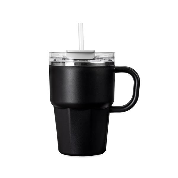 Caneca de parede dupla com interior em inox 304, revestimento externo e alça em plástico polipropileno (PP) e capacidade máxima de 550 ml. Possui tampa de pressão em AS com protetor para o bocal em PP, além de acesso para canudo e anel de vedação em silicone, permitindo duas formas de consumo de bebidas. Acompanha canudo plástico.