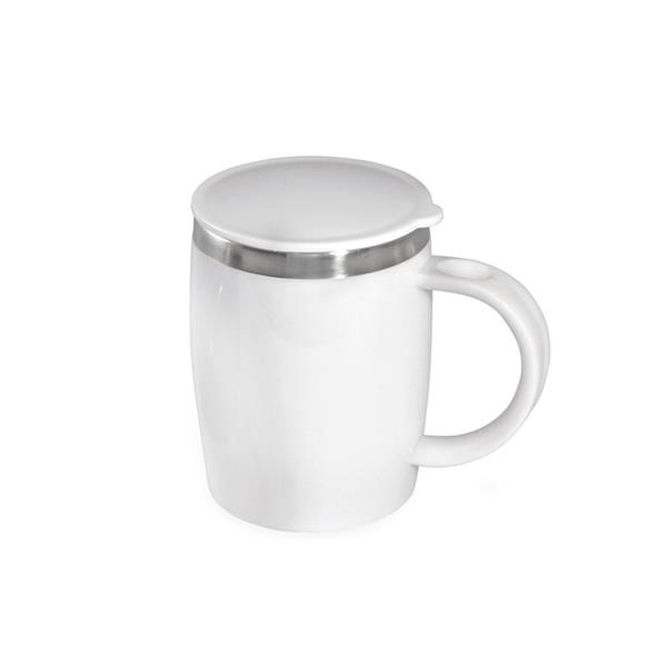 Caneca plástica com área interna de inox, capacidade de 400ml. A caneca possui tampa de encaixe com borracha de vedação e “tapete” antiderrapante na área inferior. Altura : 12,5 cm Largura : 13 cm Peso aproximado (g): 199