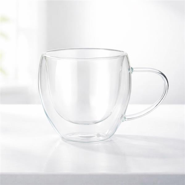 Xícara em vidro borossilicato com capacidade para até 160 ml e estrutura de parede dupla, que impede que o calor alcance a parede externa.