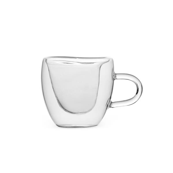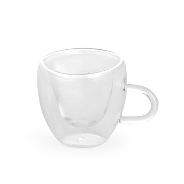Xícara de vidro com capacidade para até 80 ml. Possui contorno interno em formato de coração e estrutura de parede dupla que ajuda a impedir que a temperatura de líquidos entre em contato com a parte externa.