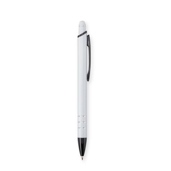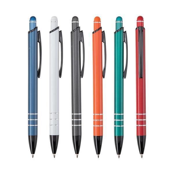 Caneta metálica com pintura em acabamento perolado, três anéis em baixo relevo na parte inferior do corpo e ponteira em plástico. Possui acionamento por clique, topo emborrachado para uso em dispositivos com telas sensíveis ao toque e carga esferográfica azul de 1,0 mm. Altura : 14,3 cm Largura : 1,4 cm Peso aproximado (g): 17
