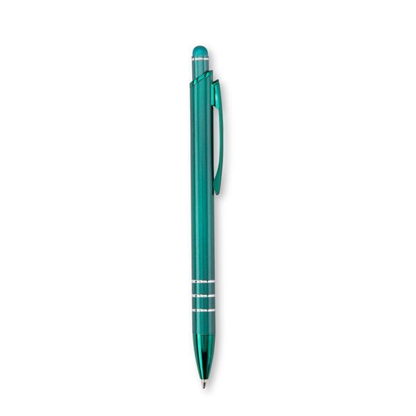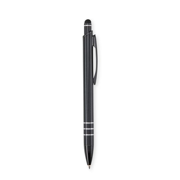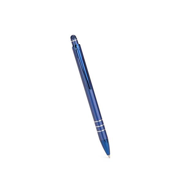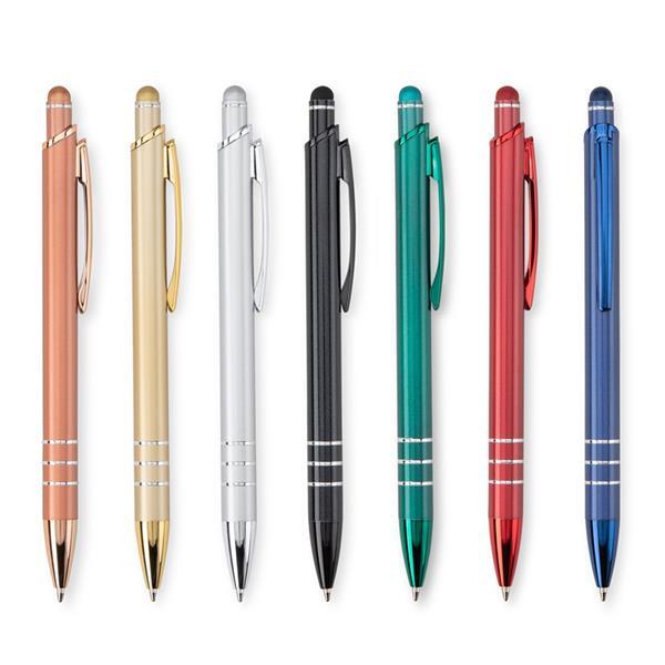 Caneta metálica com ponteira em plástico, além de detalhes na parte inferior com dois anéis prateados e topo emborrachado para interação com dispositivos de telas sensíveis ao toque. Conta com acionamento por clique e carga esferográfica azul de 1,0 mm.