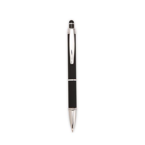 Caneta metálica com pintura de acabamento emborrachado. Possui acionamento por clique, topo emborrachado para uso em dispositivos com telas sensíveis ao toque e carga esferográfica azul de 1,0 mm.