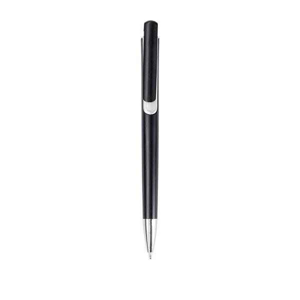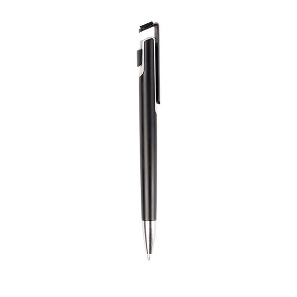 Caneta plástica com ponta metálica, acionamento por clique e abertura que funciona como suporte de celular. Possui ponteira com revestimento em feltro para limpeza de telas e carga esferográfica azul de 1.0mm.