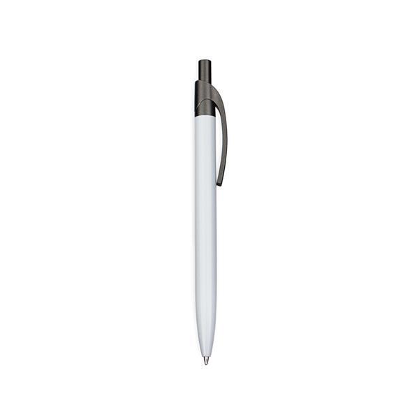 Caneta metálica com acionamento por clique e clip em plástico. Possui carga esferográfica azul de 1,0mm.
