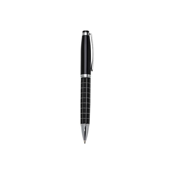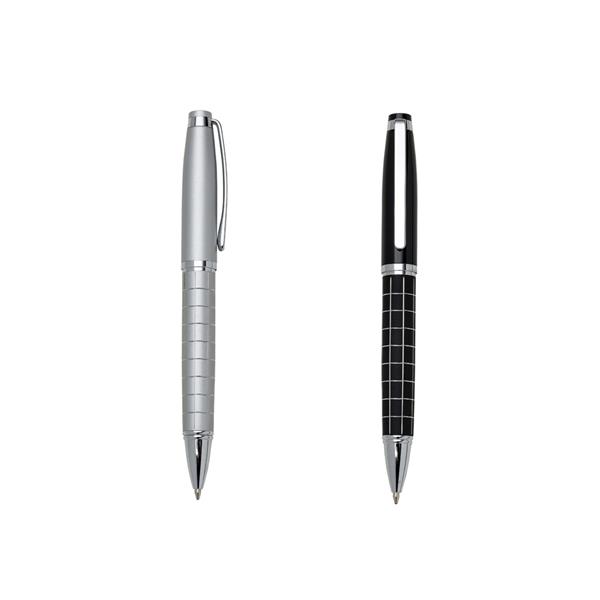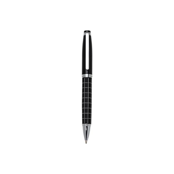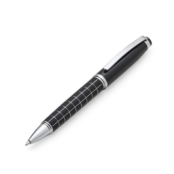 Caneta metal inteira colorida com detalhes prata e quadriculados. Clip metal com anel superior e anel central prata, possui dois anéis em relevo na ponteira. Aciona por giro Medidas aproximadas para gravação (CxL): 4 cm x 1 cm Tamanho total aproximado (CxL): 13,7 cm x 1,6 cm Peso aproximado (g): 33