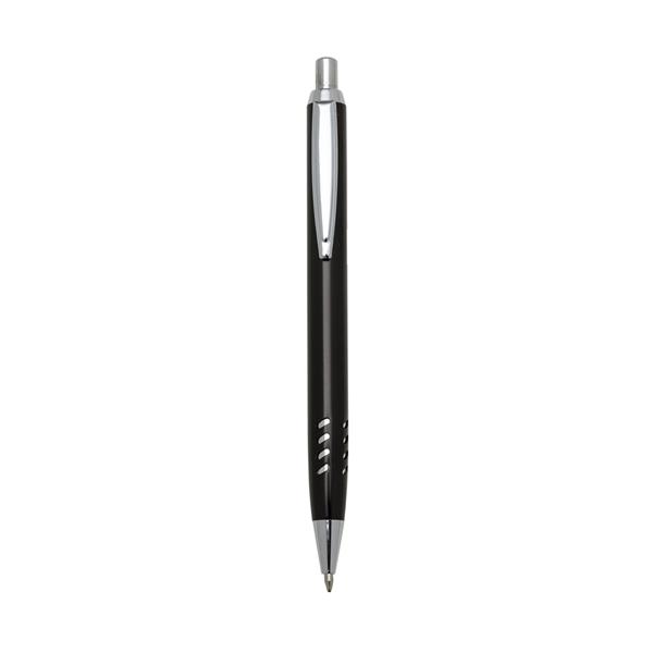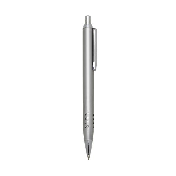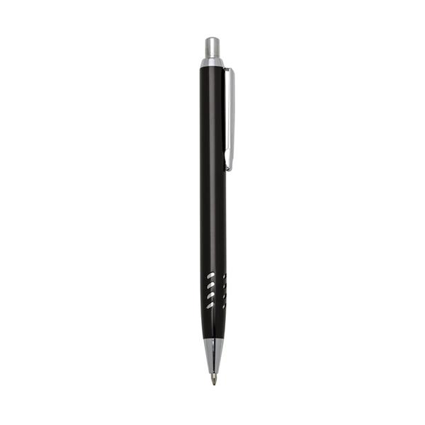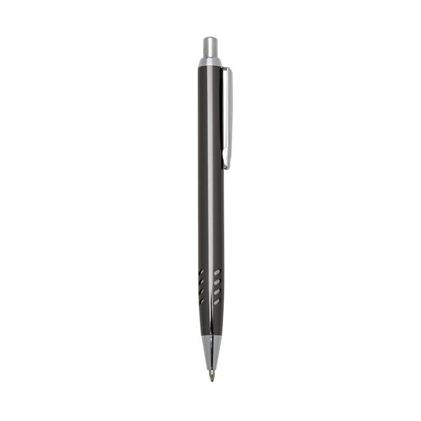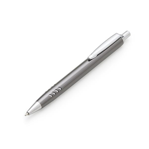 Caneta metal inteira colorida com detalhes prata. Clip metal, possui dezesseis “traços” prata na parte inferior. Aciona por clique. Medidas aproximadas para gravação (CxL): 4,3 cm x 0,8 cm Tamanho total aproximado (CxL): 13,7 cm x 1,5 cm Peso aproximado (g): 17
