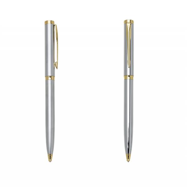 Caneta metal inteira prata com detalhes dourados. Clip dourado com um K pequeno em relevo na parte superior, “tampa acionador” dourado com uma linha em relevo, anel central dourado e ponteira dourada com dois anéis em relevo. Versão brilhante e fosca, aciona por giro. Medidas aproximadas para gravação (CxL): 4,9 cm x 0,8 cm Tamanho total aproximado (CxL): 13,3 cm x 1,4 cm Peso aproximado (g): 19