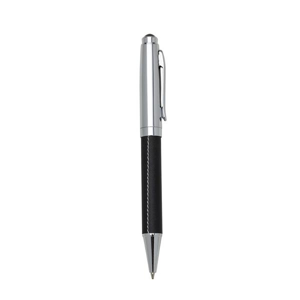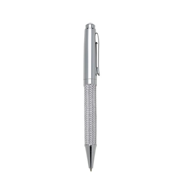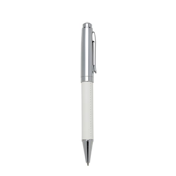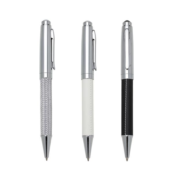 Caneta metal prata com 3 versões. Clip metal e ponta superior colorida, tem as versões couro branco, couro preto, e prata texturizado. Aciona por giro Medidas aproximadas para gravação (CxL): 4,7 cm x 1 cm Tamanho total aproximado (CxL): 13,9 cm x 1,5 cm Peso aproximado (g): 34