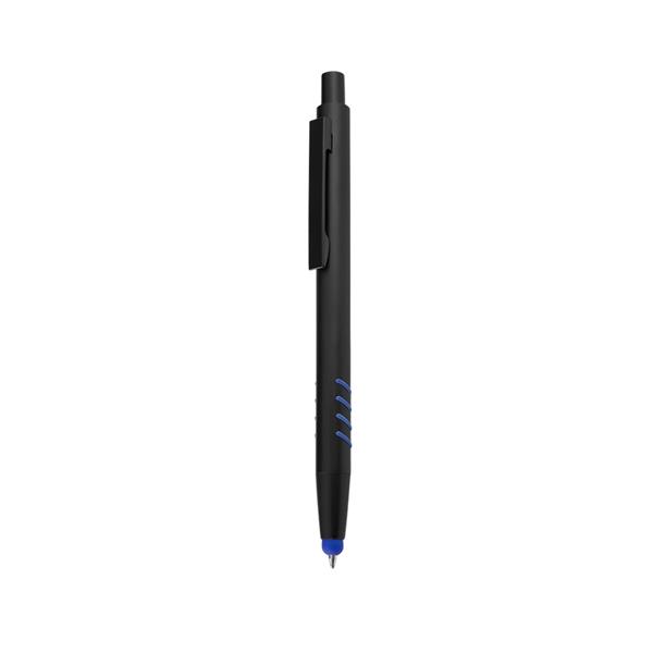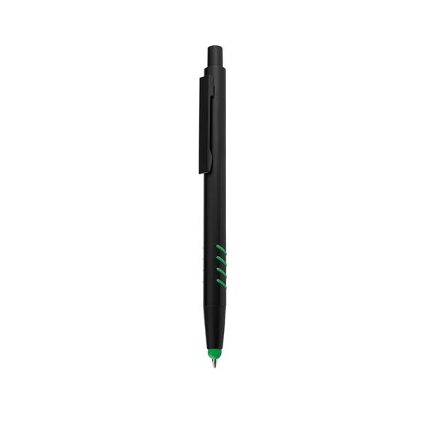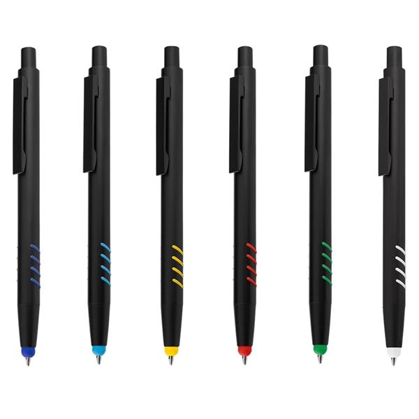 Caneta metal touch preta fosca com detalhes coloridos. Clip metálico preto brilhante, parte inferior com traços emborrachados coloridos e borracha touch inferior também colorida. Aciona por clique. Medidas aproximadas para gravação (CxL): 5 cm x 0,7 cm Tamanho total aproximado (CxL): 14,1 cm x 1,3 cm Peso aproximado (g): 15