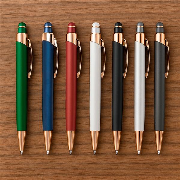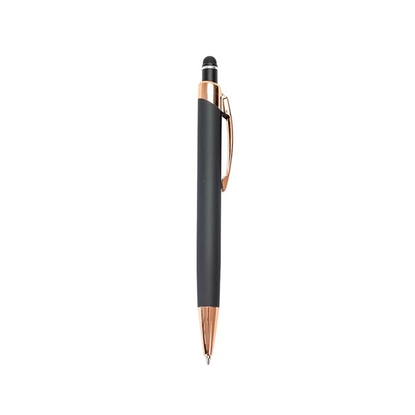 Caneta metálica com carga esferográfica azul de 1,0mm e acionamento por clique de revestimento emborrachado para interação em dispositivos com telas sensíveis ao toque. Largura : 1,7 cm Comprimento : 14,1 cm Peso aproximado (g): 17