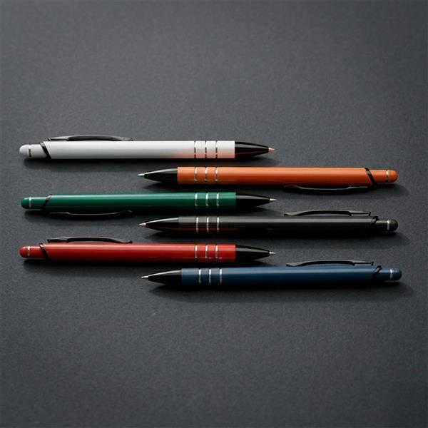 Caneta metálica com pintura em acabamento perolado, três anéis em baixo relevo na parte inferior do corpo e ponteira em plástico. Possui acionamento por clique, topo emborrachado para uso em dispositivos com telas sensíveis ao toque e carga esferográfica azul de 1,0 mm. Altura : 14,3 cm Largura : 1,4 cm Peso aproximado (g): 17