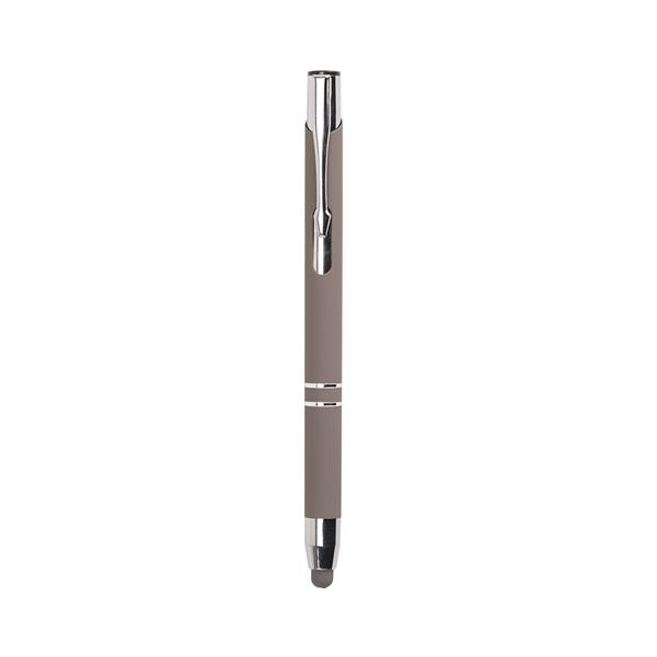 Caneta esferográfica com carga azul de 1.0mm e acionamento por clique. De construção metálica, também possui ponteira emborrachada que permite seu uso como uma caneta touch para interação com dispositivos de tela sensível ao toque.