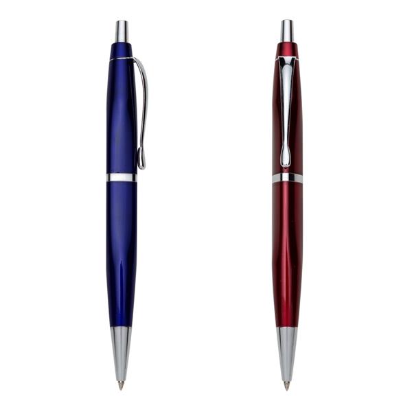 Caneta metal triangular com pintura colorida e detalhes prata. Clip metálico, acionador, anel e ponteira prata. Aciona por clique Medidas aproximadas para gravação (CxL): 2,7 cm x 0,7 cm Tamanho total aproximado (CxL): 13,8 cm x 1,6 cm Peso aproximado (g): 21
