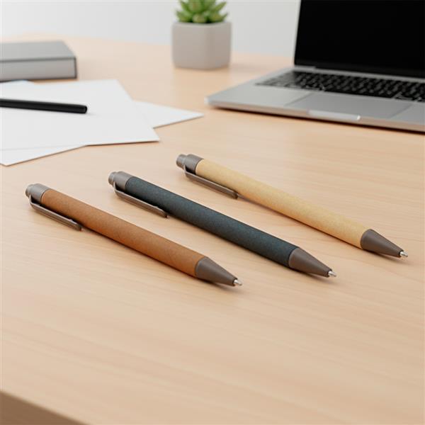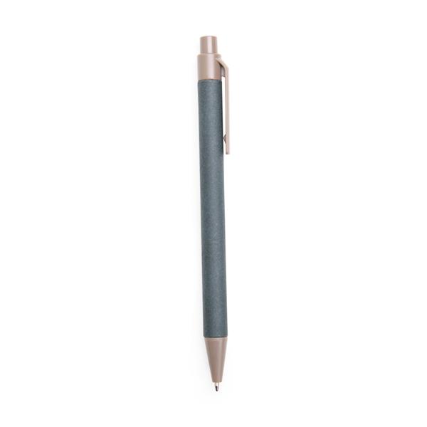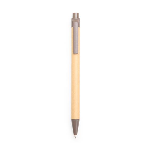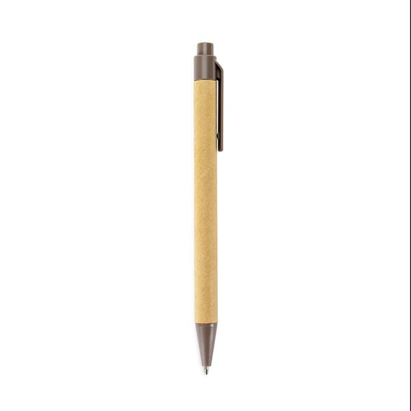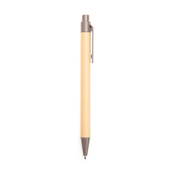 Caneta com corpo em papelão, ponteira e clip em plástico ABS, com acionamento por clique e carga esferográfica azul de 1,0mm. Largura : 1,3 cm Comprimento : 13,8 cm Peso aproximado (g): 5