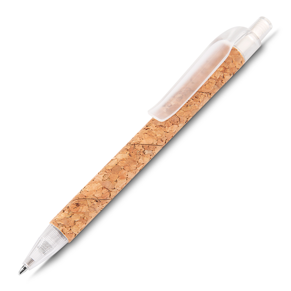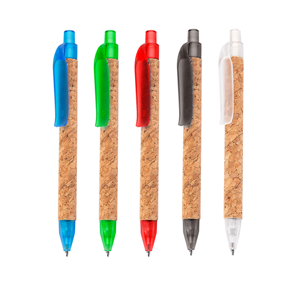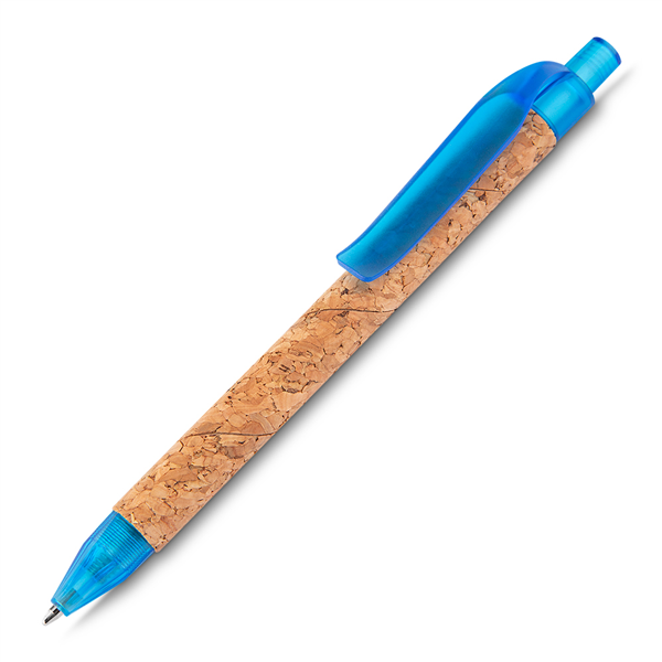 Caneta corpo em Cortiça, com detalhes em plástico. Design único e diferenciado. Cor da carga esferográfica: AZUL