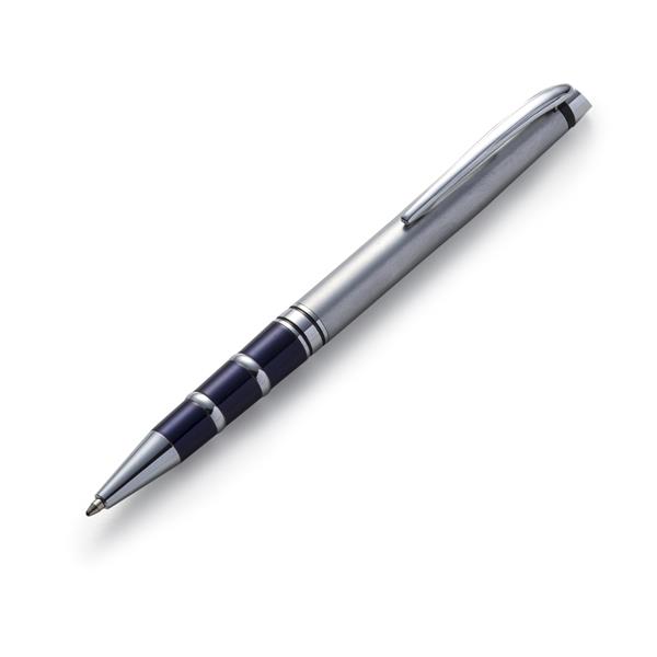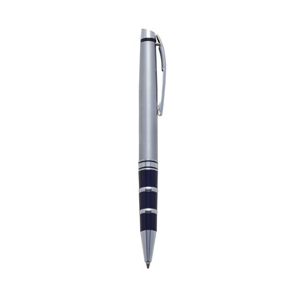 Caneta metal inteira prata com detalhes coloridos. Possui clip de metal com anel superior colorido, anel central prata com relevo e três detalhes coloridos entre dois anéis inferiores. Aciona por giro Medidas aproximadas para gravação (CxL): 4 cm x 0,7 cm Tamanho total aproximado (CxL): 13,9 cm x 1,5 cm Peso aproximado (g): 28