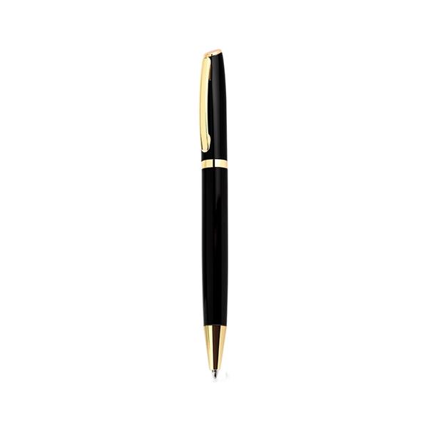 Caneta metal com detalhes em dourado. Clip metálico com anel dourado abaixo, esferográfica aciona por giro. Largura : 1,5 cm Comprimento : 14 cm Medidas aproximadas para gravação (CxL): 4 cm x 0,8 cm Peso aproximado (g): 19