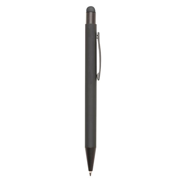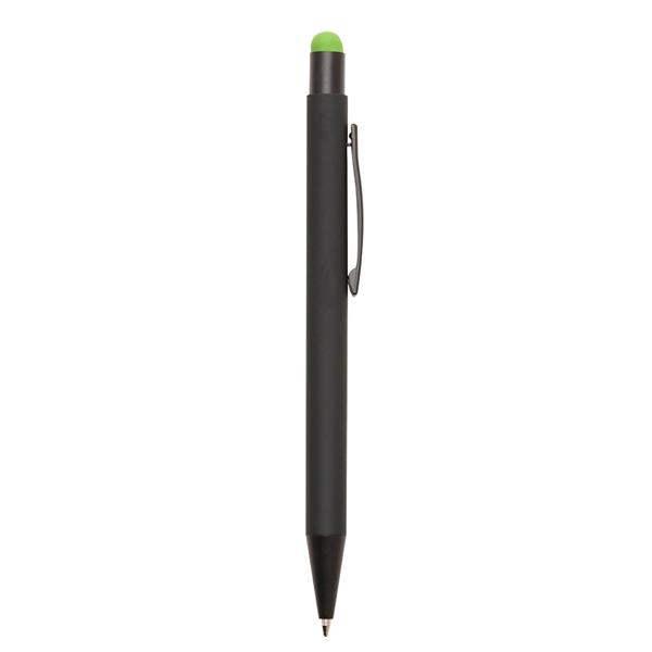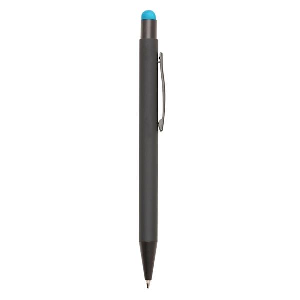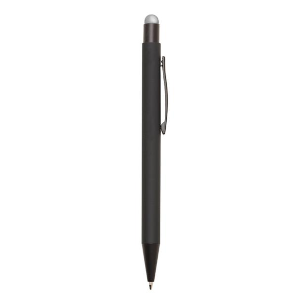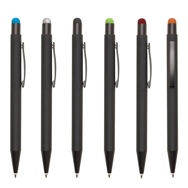 Caneta metal com ponteira touch colorida e pintura em preto fosco. Quando personalizada, a gravação possuirá a mesma cor da borracha touch. OBS.: A cor preta deverá ter a personalização amarelo/dourado. Aciona por clique. Largura : 1,4 cm Comprimento : 14,2 cm Medidas aproximadas para gravação (CxL): 4,2 cm x 0,8 cm Peso aproximado (g): 18