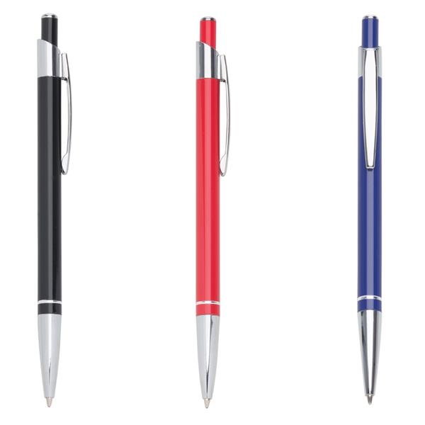 Caneta metal colorida com detalhes prata. Caneta de design fino, clip metálico com suporte e parte superior do acionador prata, possui anel inferior e ponteira em prata. Aciona por clique Medidas aproximadas para gravação (CxL): 3,7 cm x 0,7 cm Tamanho total aproximado (CxL): 13,9 cm x 1,3 cm Peso aproximado (g): 12