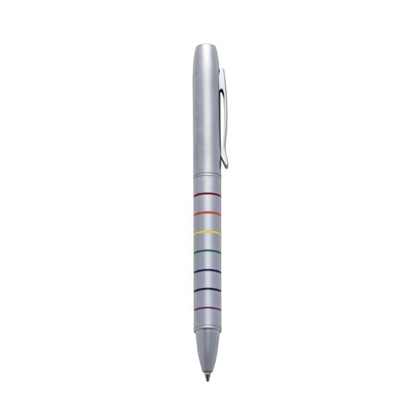 Caneta metal fosca inteira prata com sete linhas inferiores coloridas. Aciona por giro. Medidas aproximadas para gravação (CxL): 4,5 cm x 0,8 cm Tamanho total aproximado (CxL): 13,8 cm x 1,4 cm Peso aproximado (g): 30