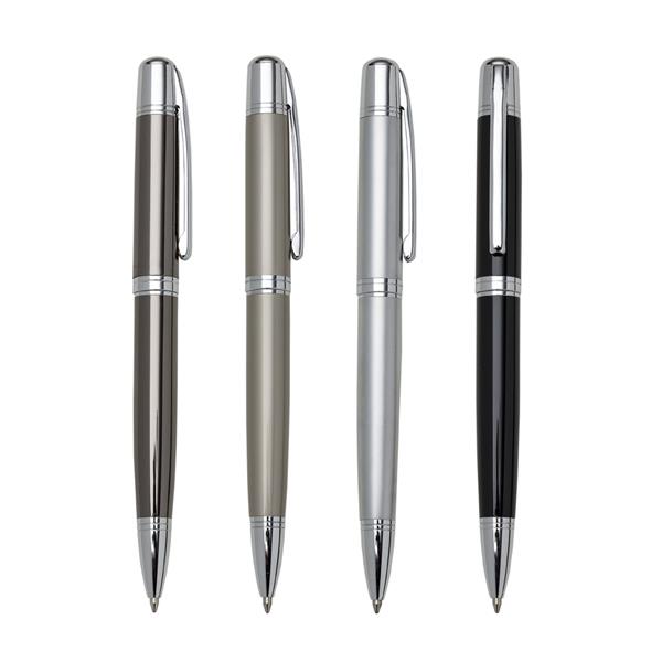 Caneta metal inteira colorida com detalhes prata. Clip metal com dois anéis em relevo, anel centralizado e dois anéis em relevo na ponteira. Aciona por giro. Largura : 1,5 cm Comprimento : 14,2 cm Medidas aproximadas para gravação (CxL): 4,2 cm x 1 cm Peso aproximado (g): 32