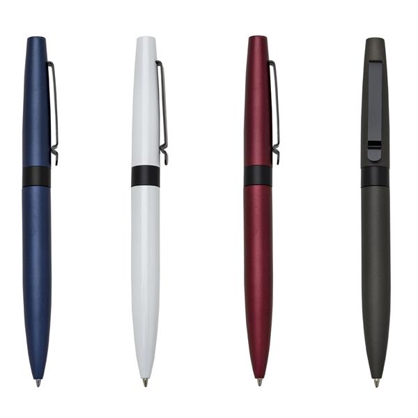 Caneta metal inteira colorida com pintura fosca, clip metal preto e anel central preto Medidas aproximadas para gravação (CxL): 4,5 cm x 0,8 cm Tamanho total aproximado (CxL): 14,4 cm x 1,5 cm Peso aproximado (g): 28