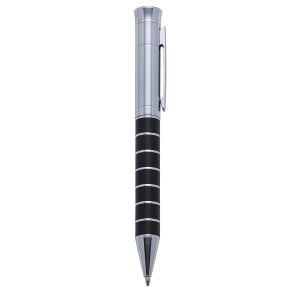 Caneta metal prata brilhante com detalhes preto. Possui seis anéis prateados, aciona por giro. Medidas aproximadas para gravação (CxL): 3 cm x 1 cm Tamanho total aproximado (CxL): 13,4 cm x 1,5 cm Peso aproximado (g): 27