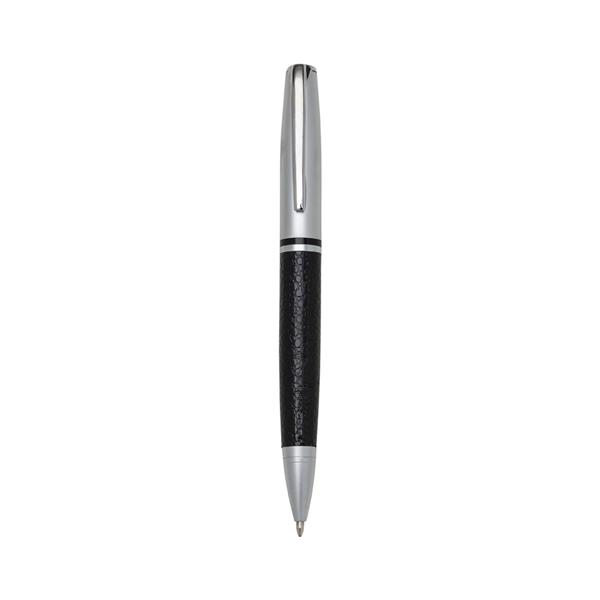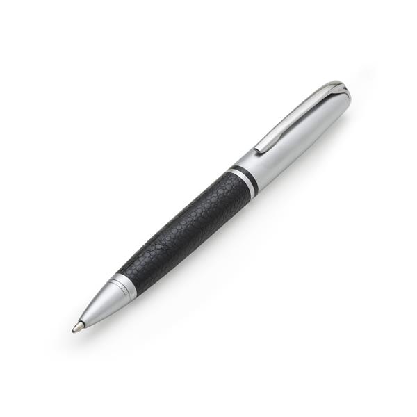 Caneta metal prata com couro preto. Clip metal, possui anel central preto e dois anéis em relevo na ponteira. Possui as versões fosca e brilhante, aciona por giro. Largura : 1,6 cm Comprimento : 13,7 cm Medidas aproximadas para gravação (CxL): 4 cm x 1 cm Peso aproximado (g): 33