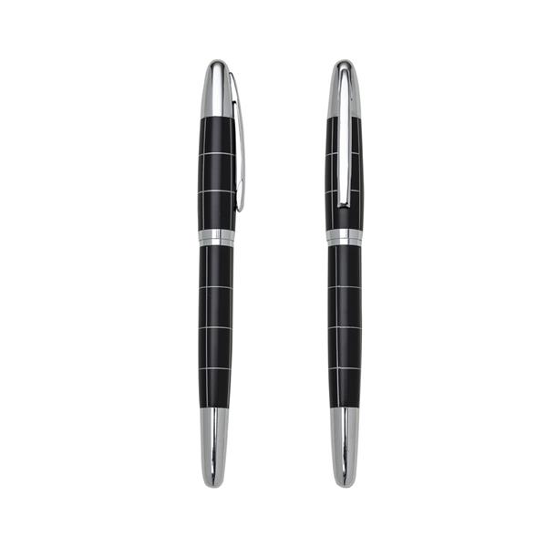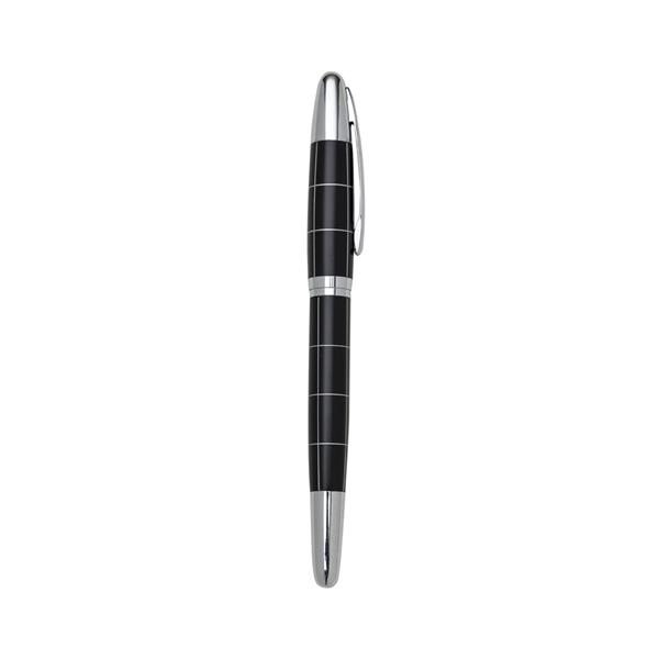 Caneta metal roller com tampa. Caneta preta quadriculada e com detalhes prata, clip metal. Possui uma faixa lisa na tampa para personalização. Medidas aproximadas para gravação (CxL): 3,6 cm x 0,9 cm Tamanho total aproximado (CxL): 13,7 cm x 1,4 cm Peso aproximado (g): 25