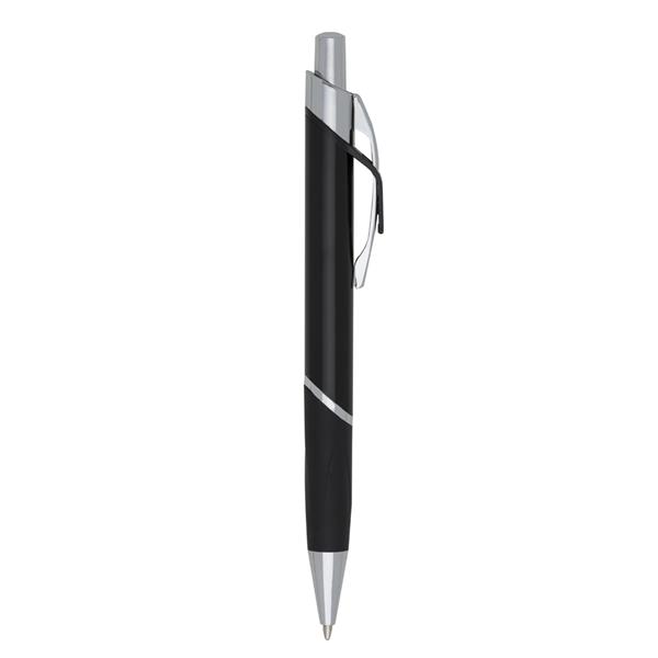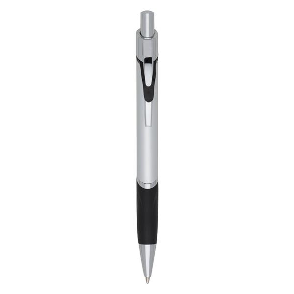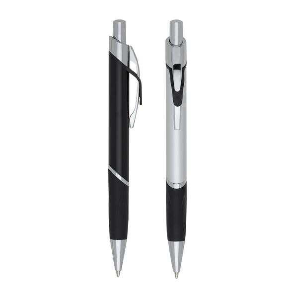 Caneta metal inteira colorida com detalhes prata. Clip metal com suporte preto plástico, possui um anel e detalhe emborrachado com relevo na parte inferior. Aciona por clique. Altura : 14,3 cm Largura : 1,9 cm Medidas aproximadas para gravação (CxL): 3 cm x 1 cm Peso aproximado (g): 19