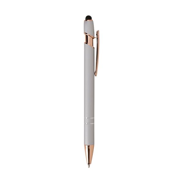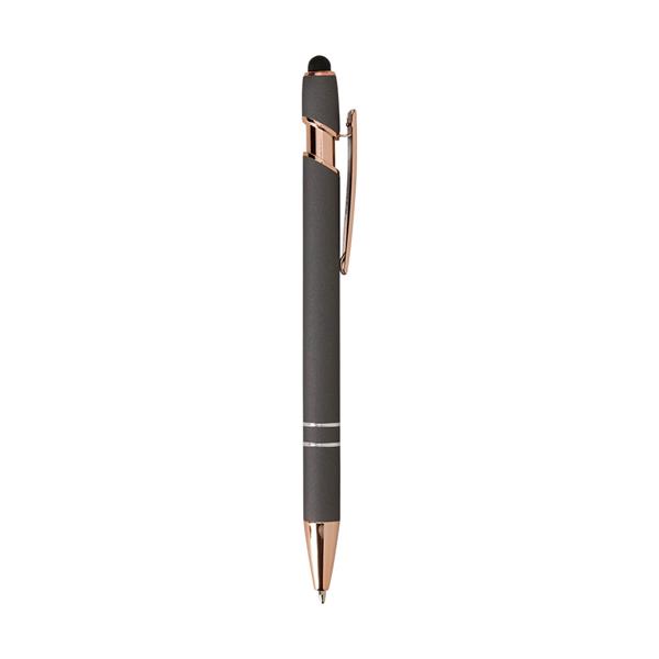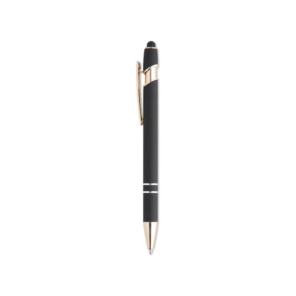 Caneta metálica touchscreen com acabamento similar à borracha, acionamento por clique e carga esferográfica azul 1.0mm. Largura : 1,5 cm Comprimento : 14,1 cm Peso aproximado (g): 18