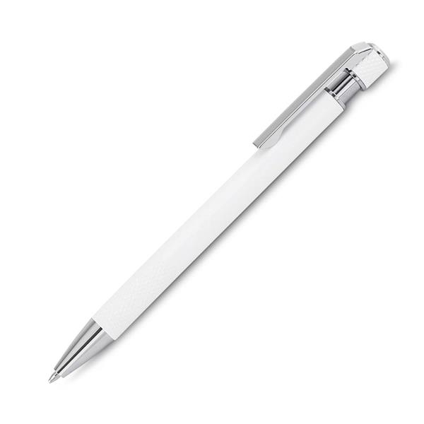 Caneta esferográfica com corpo em alumínio reciclado, acionador e clipe cromado, escrita em tinta azul. Refil substituível tipo Parker.