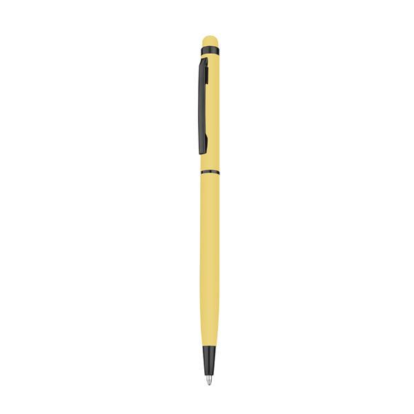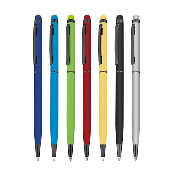 Caneta esferográfica de metal com escrita em azul, com ponta touch com corpo emborrachado. Detalhe preto. Medidas do produto: 13,5xø0,6cm (AxøD) Peso do produto: 0,010kg
