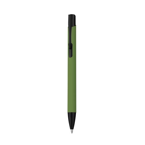 Caneta esferográfica de metal escrita em azul, com corpo emborrachado. Medidas do produto: 14,5xø0,6cm (AxøD) Peso do produto: 0,014kg
