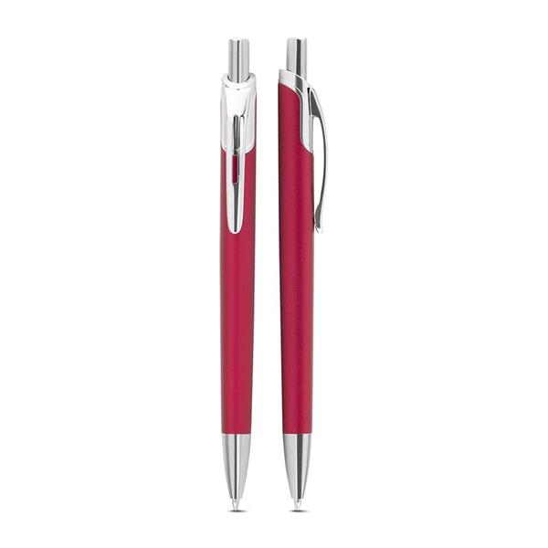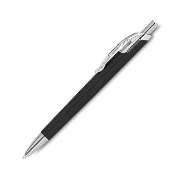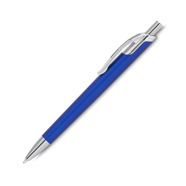 Caneta com corpo em alumínio reciclado, acionador e clipe cromado, escrita esferográfica em azul.